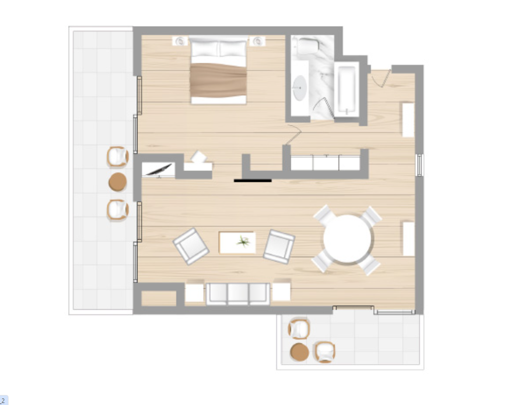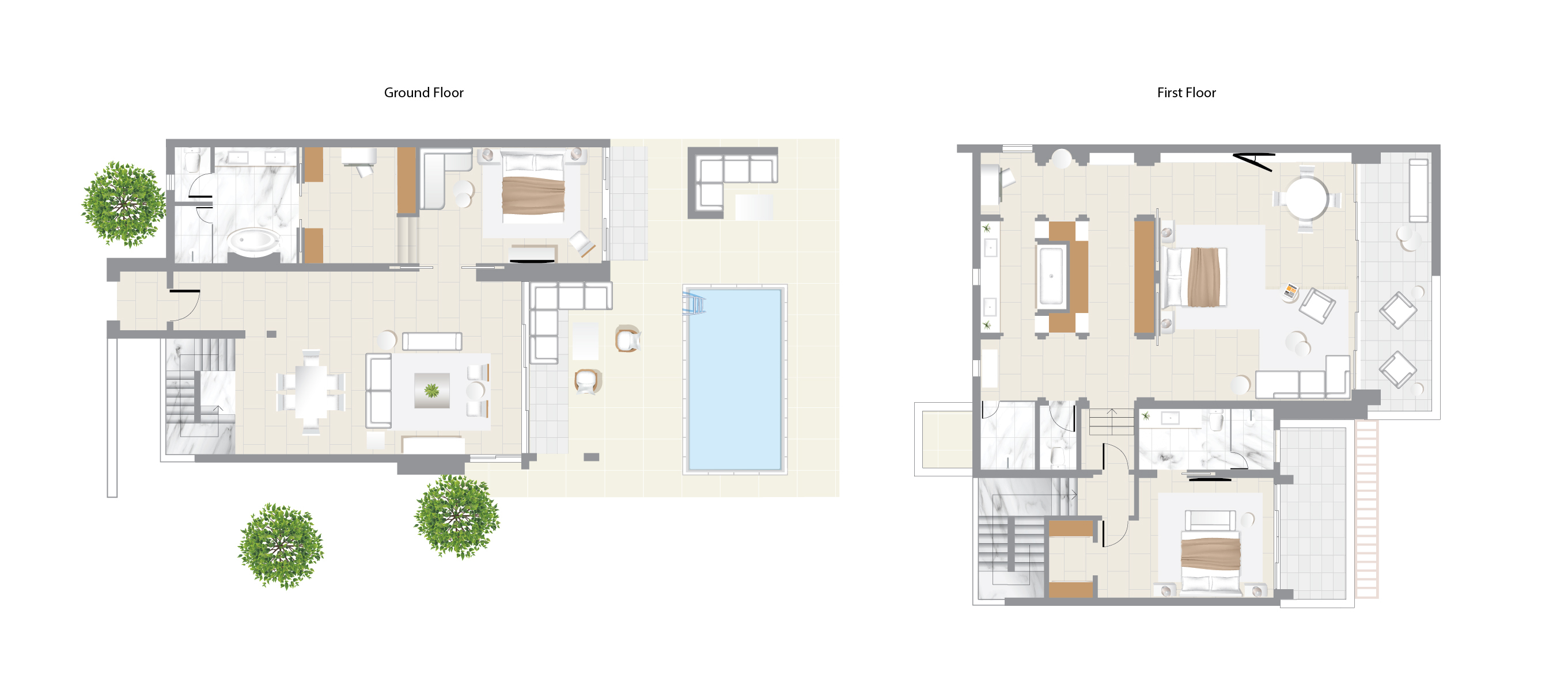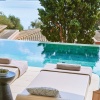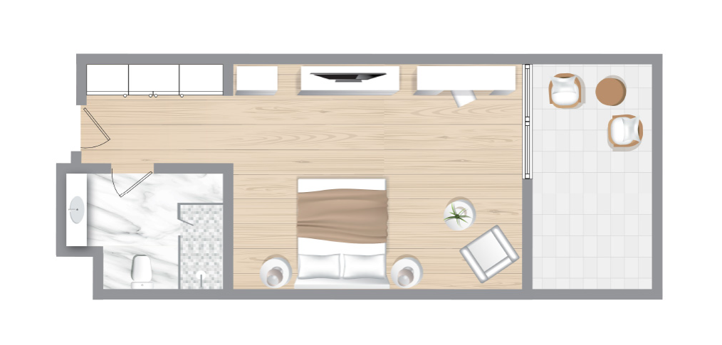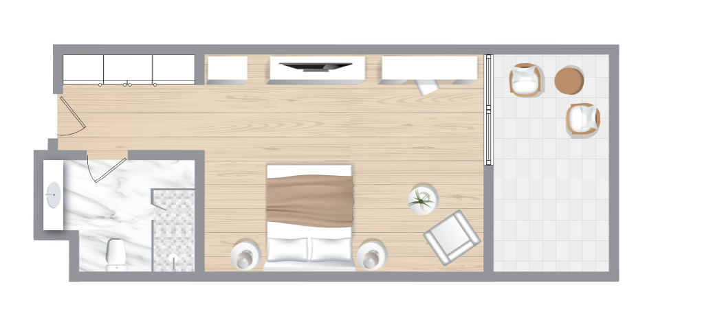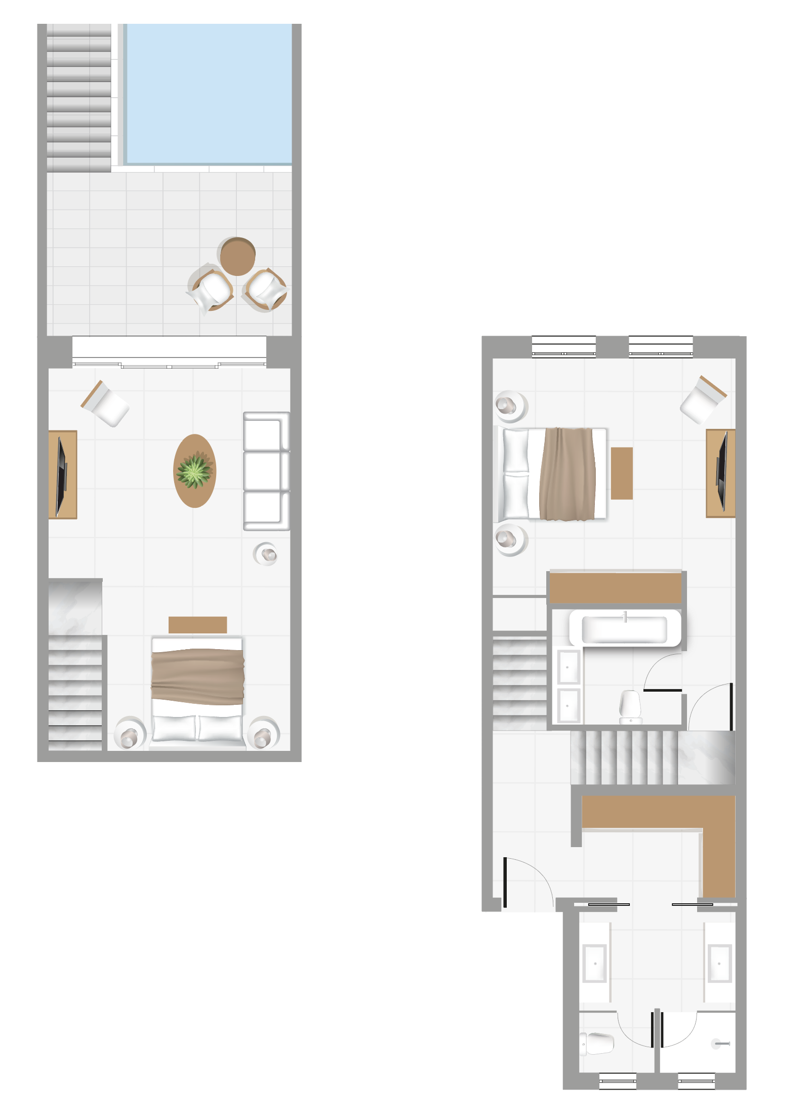 Открытая планировка, двуспальная или 2 односпальные кровати, диван-софа, ванная комната с ванной или душем, веранда (6 м²) с лежаком, прямой доступ к общему бассейну, план номера;