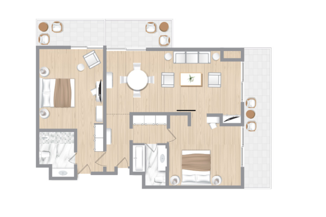Номера расположены в основном здании на 2-4 этажах, панорамный вид на море, 2 спальни с 2 двуспальными кроватями, гостиная зона с диваном и обеденной зоной (дополнительно возможны 2 односпальные кровати), 2 ванные комнаты с ванной, большие шкафы, балкон (21 м²), план номера;