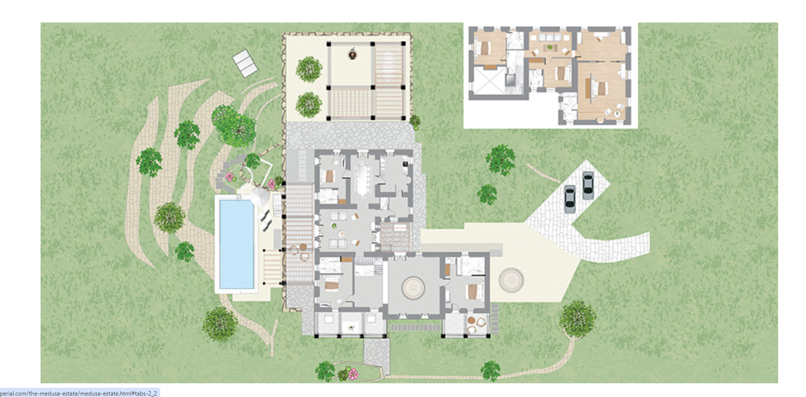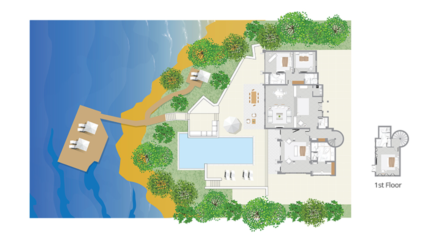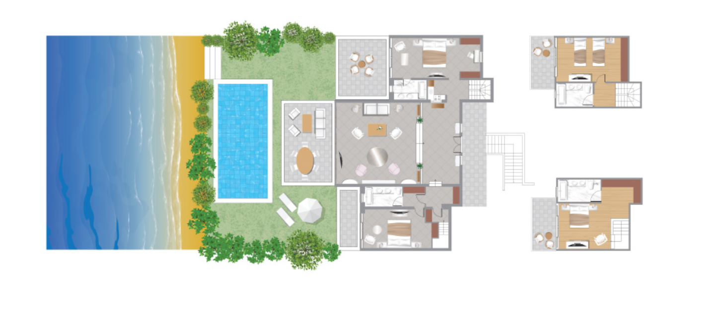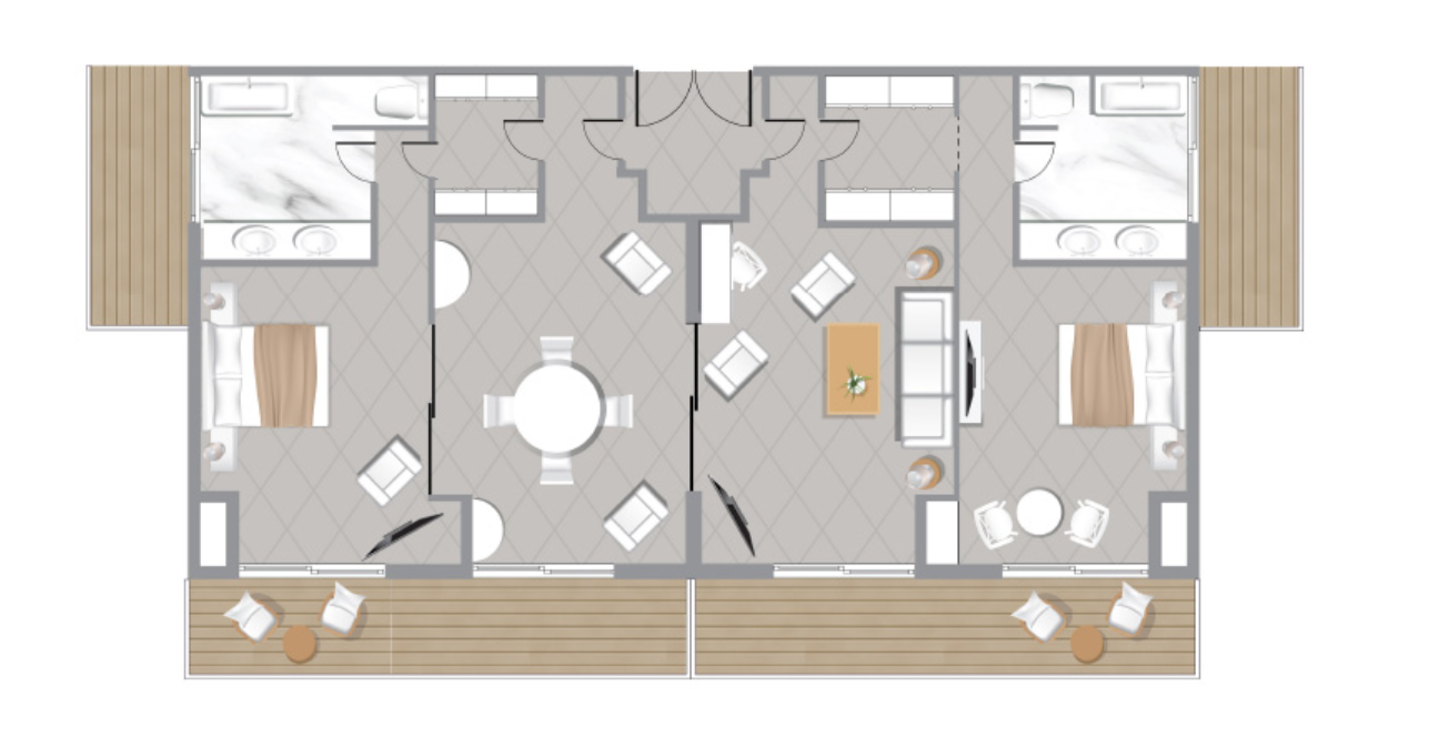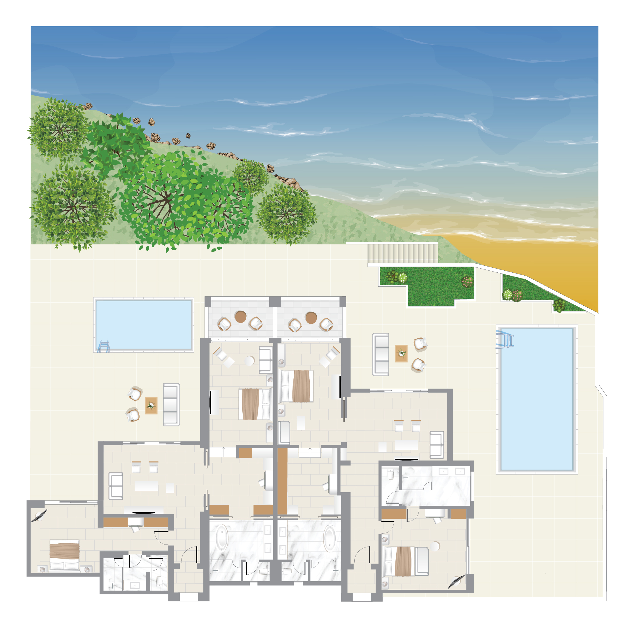 Номера расположены в пентхаусе основного здания, панорамный вид на море, 2 спальни с двуспальными кроватями, гостиная комната, отдельная обеденная комната и кабинет, гардеробная, 2 ванные комнаты с гидромассажными ваннами, 4 меблированных балкона (20 м²), план номера;
