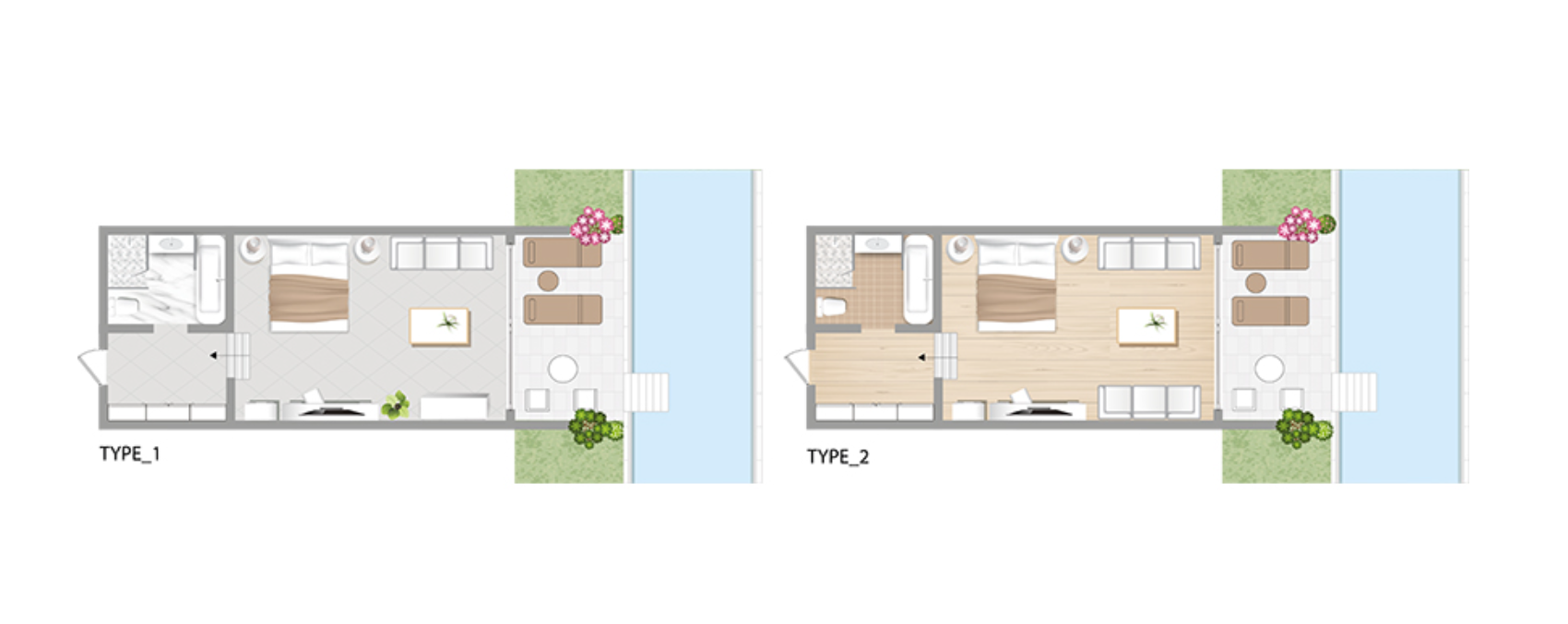 • Swim Up Junior Bungalow Suite (33 м², макс. 3 чел.).