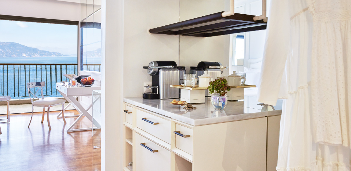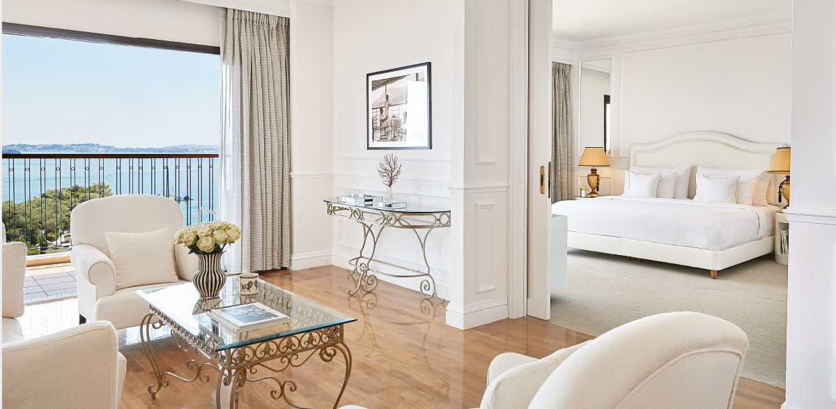 Полностью обновлённые номера к сезону 2024, расположены в основном здании на 5-м этаже, спальня с двуспальной кроватью king-size, гостиная комната с диваном и дополнительно возможны 2 односпальные кровати, 2 ванные комнаты (одна с 2 раковинами и душем, вторая с 1 раковиной и 1 душем),  панорамный вид на море, балкон (12 м²), план номера;