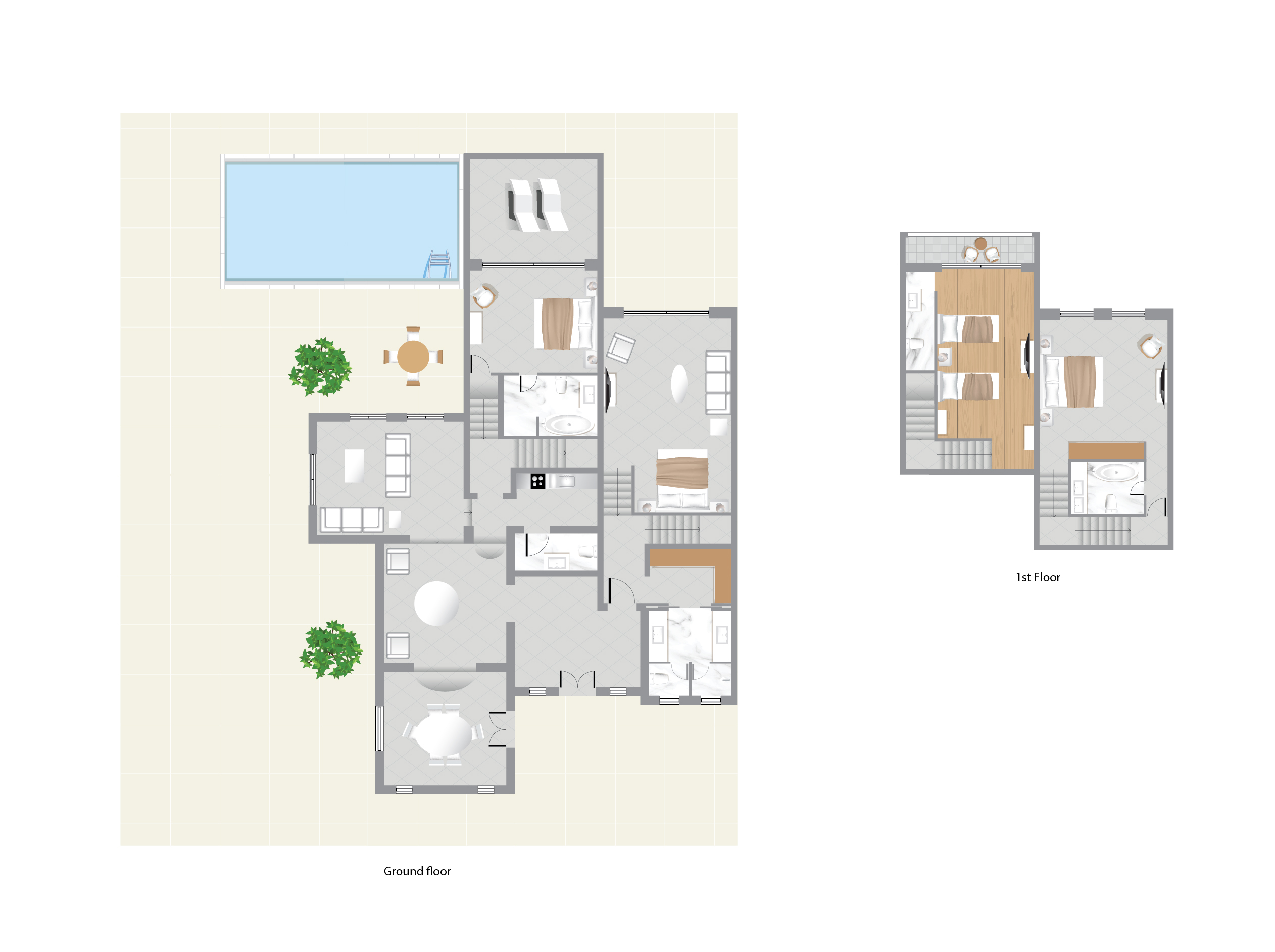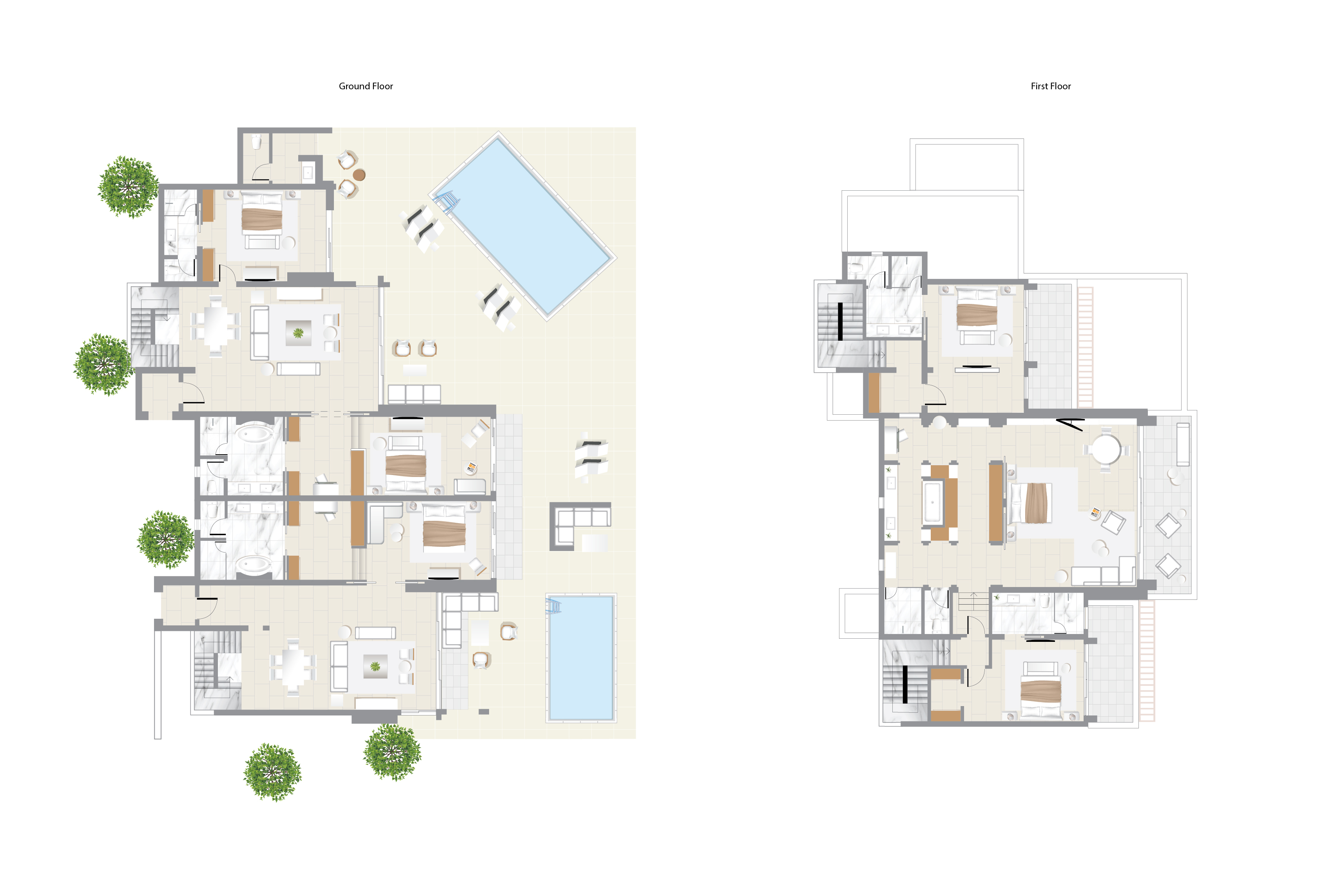 Номера расположены на цокольном и первом этажах, двуспальная или 2 односпальные кровати, 2 дивана-софа, ванная комната с ванной или душем, балкон или терраса (6 м²), общий бассейн, план номера;