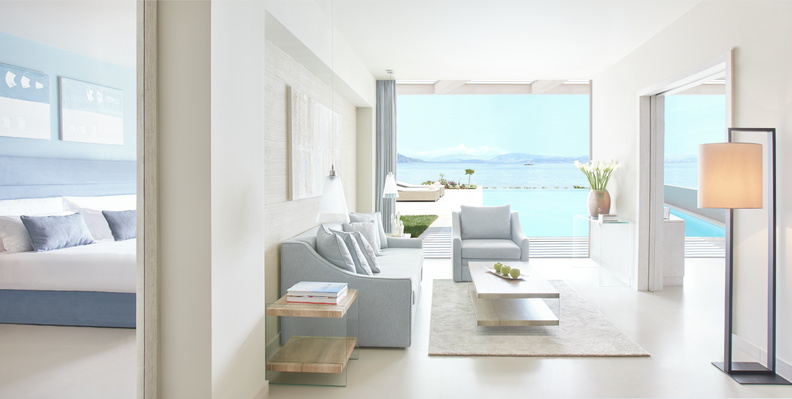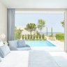 Номера расположены на первом этаже корпуса Sea, в непосредственной близости к пляжу, спальня с двуспальной кроватью, гостиная комната с диваном-кроватью, ванная комната с ванной и душевой кабиной, частный бассейн с подогревом, вид на море, план номера, фото номера;