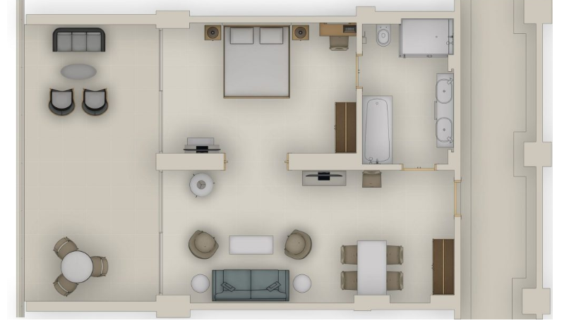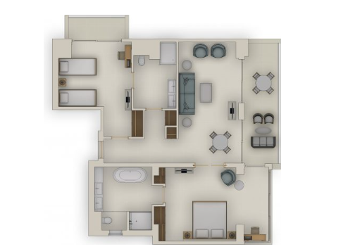 Номера расположены на втором или третьем этаже трёхэтажного бунгало или на первом этаже корпуса Sky, 2 спальни (двуспальная кровать и 2 односпальные кровати), гостиная комната с диваном-кроватью, 2 ванные комнаты: одна – с ванной и душевой кабиной с тропическим душем, вторая – с душевой кабиной, меблированный балкон или терраса, вид на бассейн/вид на море, план номера;