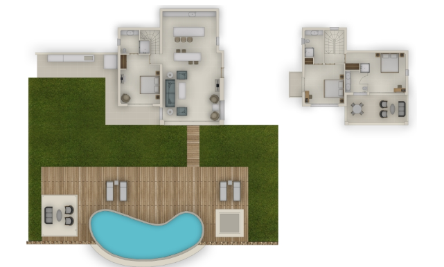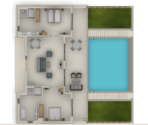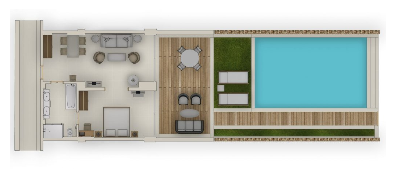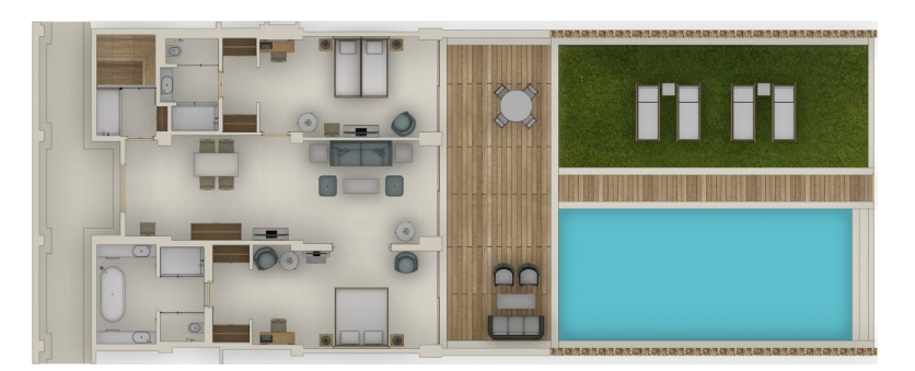 Расположены в одноэтажном бунгало на первой береговой линии, состоит из отдельной просторной гостиной с диваном-кроватью и двух спальных комнат (двуспальная и 2 односпальные кровати), 2 ванные комнаты: одна – с ванной и душевой кабиной с тропическим душем, вторая – с душевой кабиной, частный бассейн с подогревом (50м²), вид на море, план номера, фото номера;