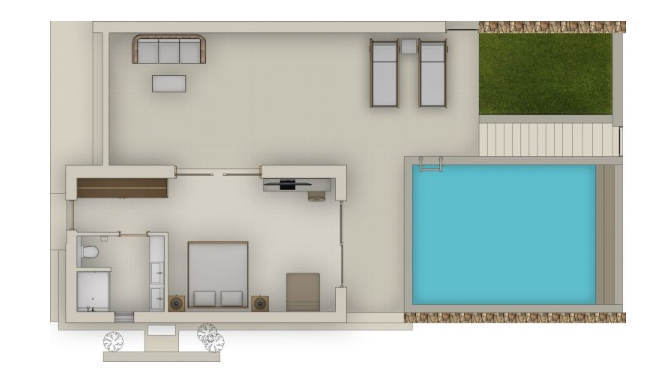 Номера расположены в одноэтажном бунгало, спальня с двуспальной кроватью, зона гостиной с диваном-кроватью, ванная комната с душевой кабиной, частный сад и бассейн площадью 28 м² с подогревом, вид на сад, план номера, фото номера;