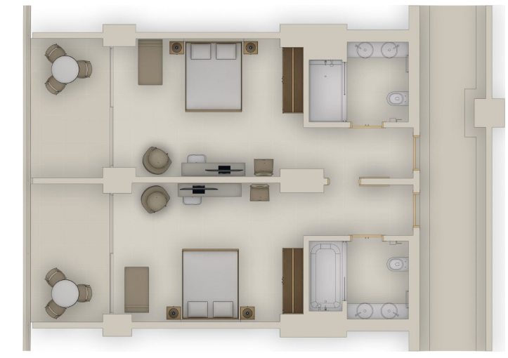 Состоит из 2-х номеров Superior, соединенных межкомнатной дверью, Две ванные комнаты с ванной или душевой кабиной, меблированный балкон, вид на окрестности/ вид на море, план номера, фото номера.