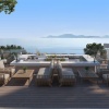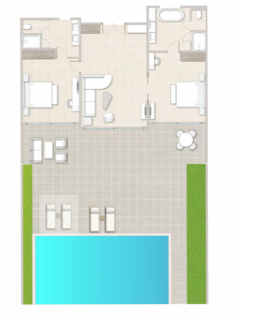 Номера расположены на первом этаже бунгало, 2 спальни: двуспальная и 2 односпальные кровати, отдельная гостиная комната с диваном-кроватью, панорамные окна, 2 ванные комнаты: в одной ванная и душевая кабина, в другой - душевая кабина, меблированная терраса, частный бассейн (50 м²), вид на море, план номера, фото номера.