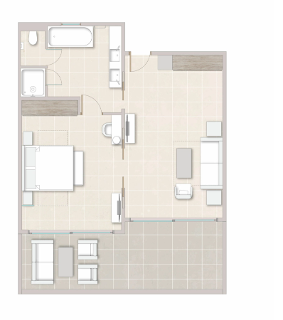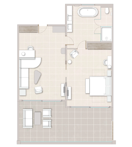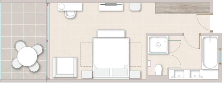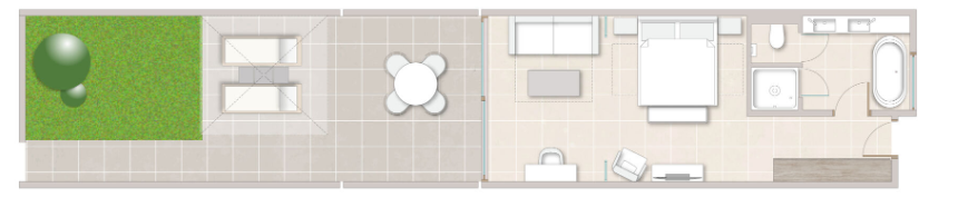 Открытая планировка, двуспальная кровать, зона гостиной с диваном-кроватью, ванная комната с ванной и душевой кабиной, терраса и собственный сад, вид на бассейн, план номера, фото номера;