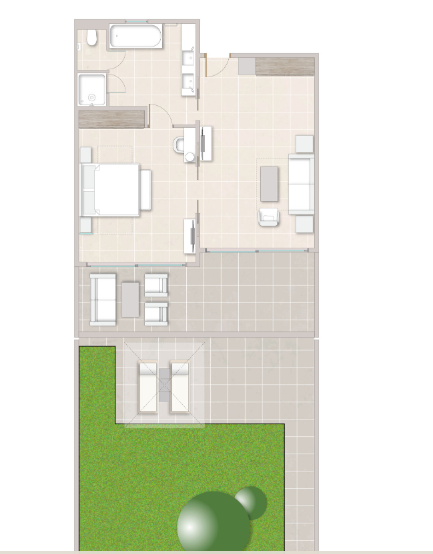 Спальня с двуспальной кроватью, гостиная комната с диваном-кроватью, ванная комната с ванной и душевой кабиной, меблированная терраса с частный садом, вид на сад, план номера, фото номера;