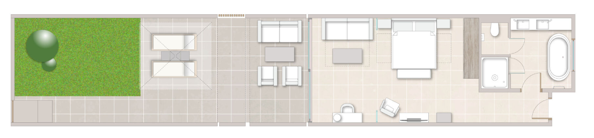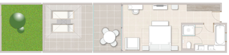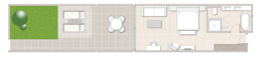 Двуспальная кровать или 2 односпальные кровати, панорамные окна, ванная комната с ванной и душевой кабиной, терраса и собственный сад, план номера, фото номера;