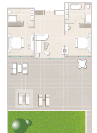 Номера расположены на первом этаже бунгало, 2 спальни: двуспальная и 2 односпальные кровати, отдельная гостиная комната с диваном-кроватью, панорамные окна, 2 ванные комнаты: в одной ванная и душевая кабина, в другой - душевая кабина, меблированная терраса, частный сад, вид на сад/вид на море, план номера, фото номера;