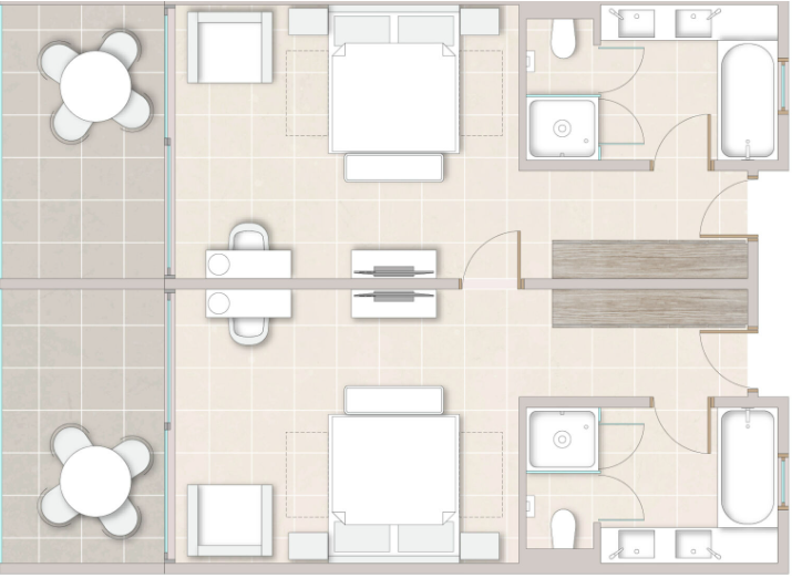 2 двухместных номера с межкомнатной дверью, панорамные окна, 2 ванные комнаты с ванной и душевой кабиной, меблированный балкон, вид на бассейн, план номера, фото номера;
