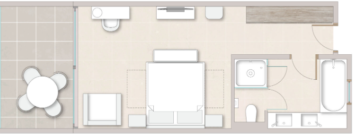 Двуспальная или 2 односпальные кровати, панорамные окна, ванная комната с ванной и душевой кабиной, меблированный балкон, вид на сад/бассейн/море, план номера, фото номера;