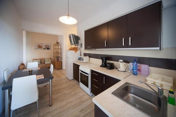 Во всех апартаментах: кухня, холодильник,плита, чайник, кофеварка, микроволновка, гостиная зона, балкон/терраса, ванная комната, душ, телевизо со спутниковыми каналами, телефон.