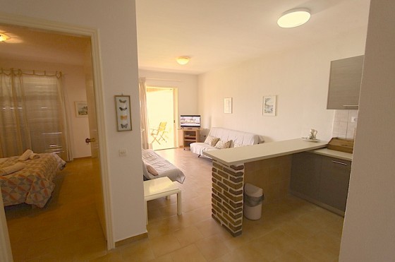 AB3 (54 кв.м.), на первой линии от моря. Одна спальня, гостиная, кухня. В гостиной можно поставить еще 2 кровати дополнительные. Ванная, кондиционер. Рассчитаны на 2 – 4 человека. A4 (60 кв.м.), 1 спальня + маленькая комната с двухъярусной кроватью, ванная, гостиная, кухня, ТВ, два балкона. Расчитаны на 2 – 6 человек