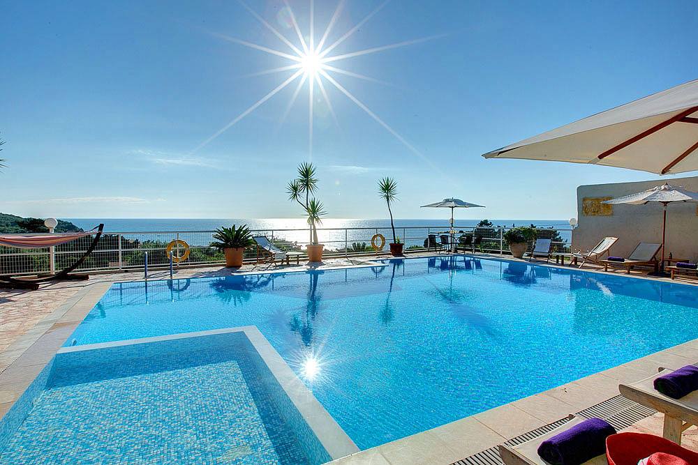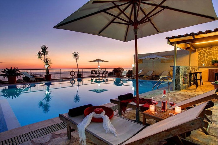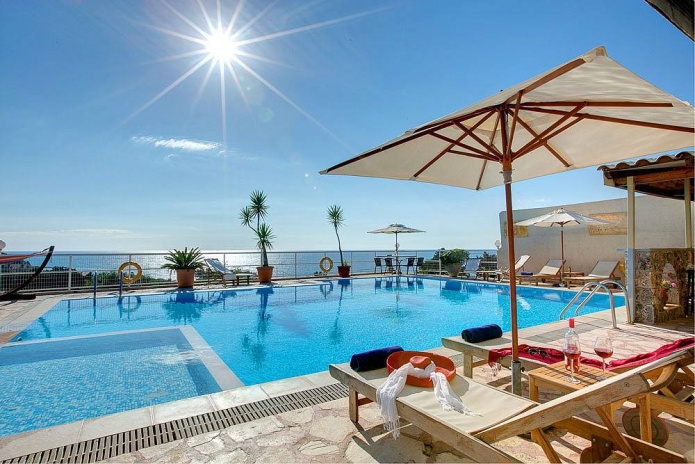 Вилла 230 м2, 2 этажа, 5 спален: 2 спальни с 2 односпальными кроватями, 2 спальни с двуспальной кроватью, балконом и джакузи, King Suite с двуспальной кроватью king size, балконом и джакузи, гостиная с 2 диванами, столовая и кухня, частный бассейн, максимальное размещение 10 гостей, вид на море
