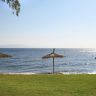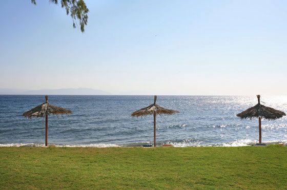 Песчано-галечный пляж перед отелем. Шезлонги и зонты на пляже бесплатно.