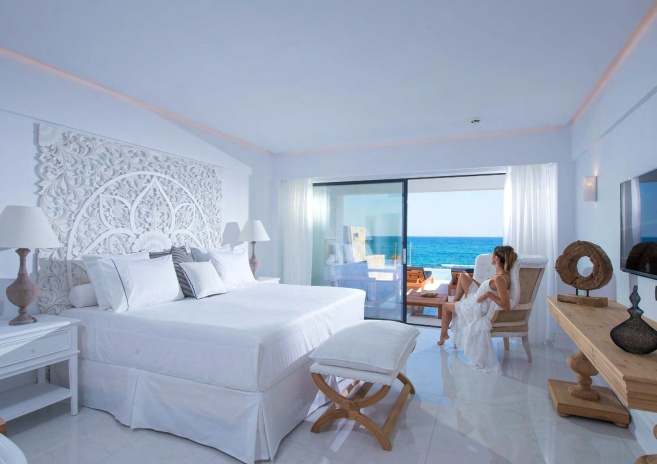 Abaton Collection Suite With Sharing Pool (45 кв. м, общая – 73 кв.м.). Макс. – 3 взрослых. Двухуровневый номер с панорамным видом на море. Верхний уровень – спальня открытого плана, нижний уровень – гостиная. Прямой выход к общему бассейну.