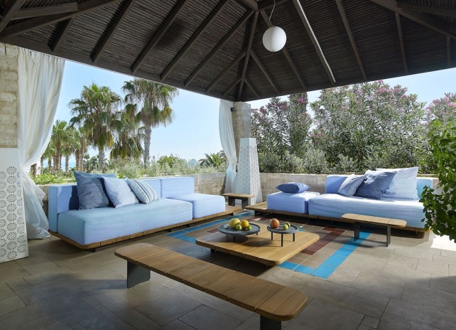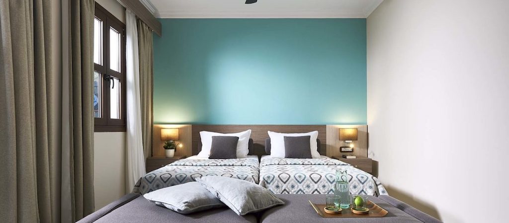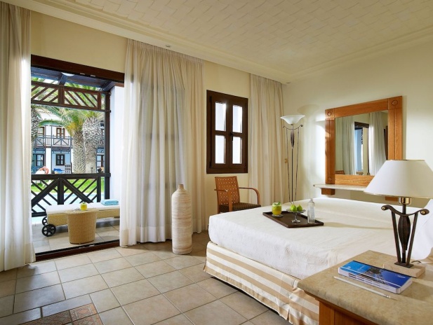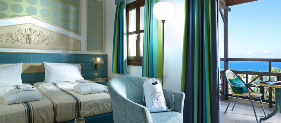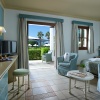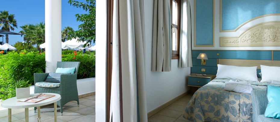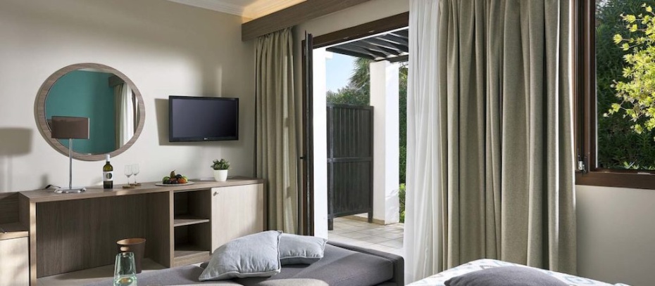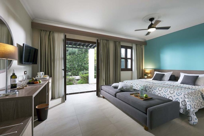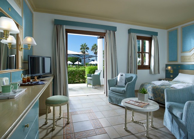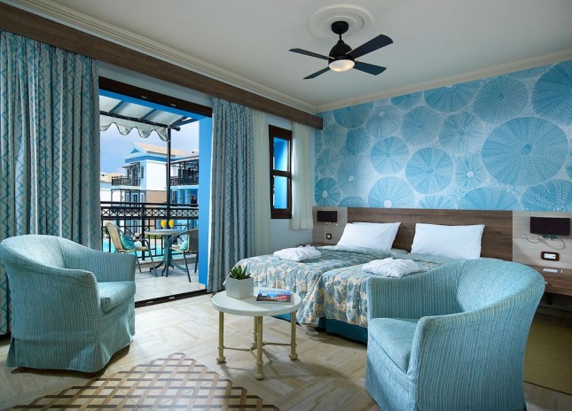 • Family Junior Suite Sharing Pool (расположены в корпусах Ifigenia & Athina, вид на сад, на нижнем этаже, общий бассейн на несколько номеров, спальня с зоной гостиной, основная кровать – 2 односпальные (двуспальная по запросу), доп. – 2 кресло-кровати,макс. 2+2 чел., 49 м2)