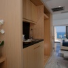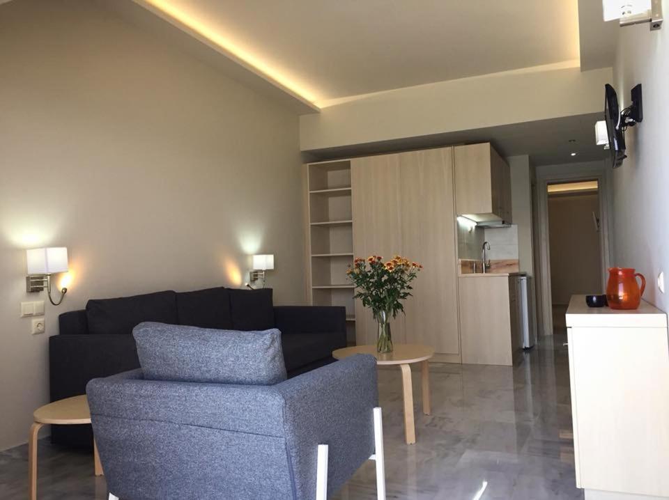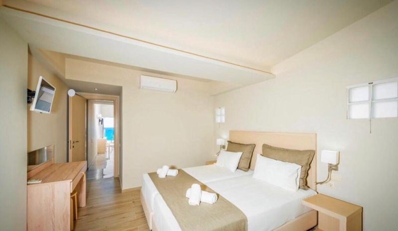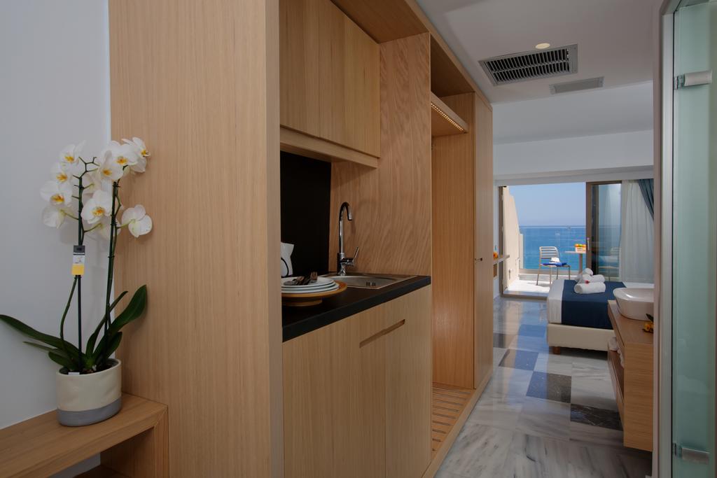 Все просторные номера-студио и апартаменты с мини-кухней оборудованы кондиционером и выходят на меблированный балкон. Из некоторых номеров открывается прямой вид на Критское море и город.