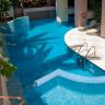 Открытый плавательный бассейн с зонтиками и шезлонгами