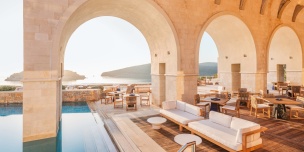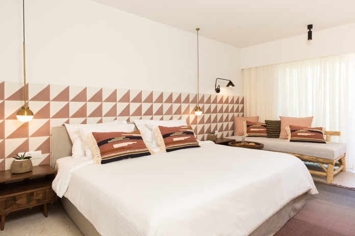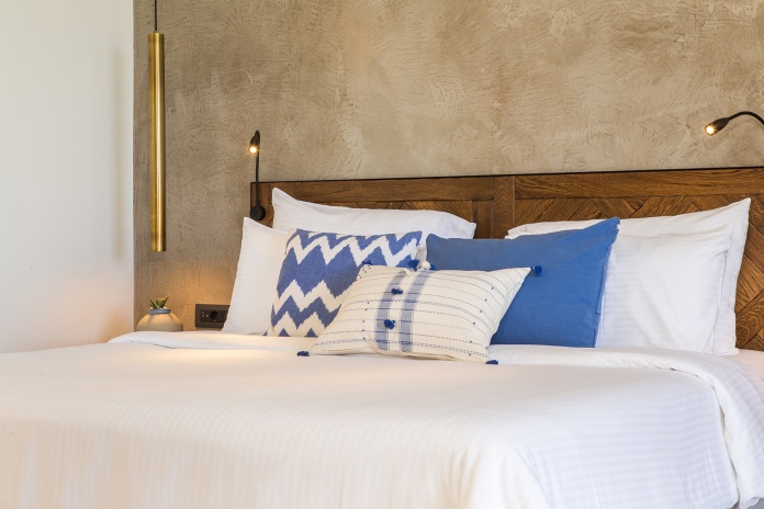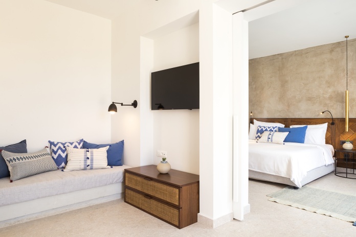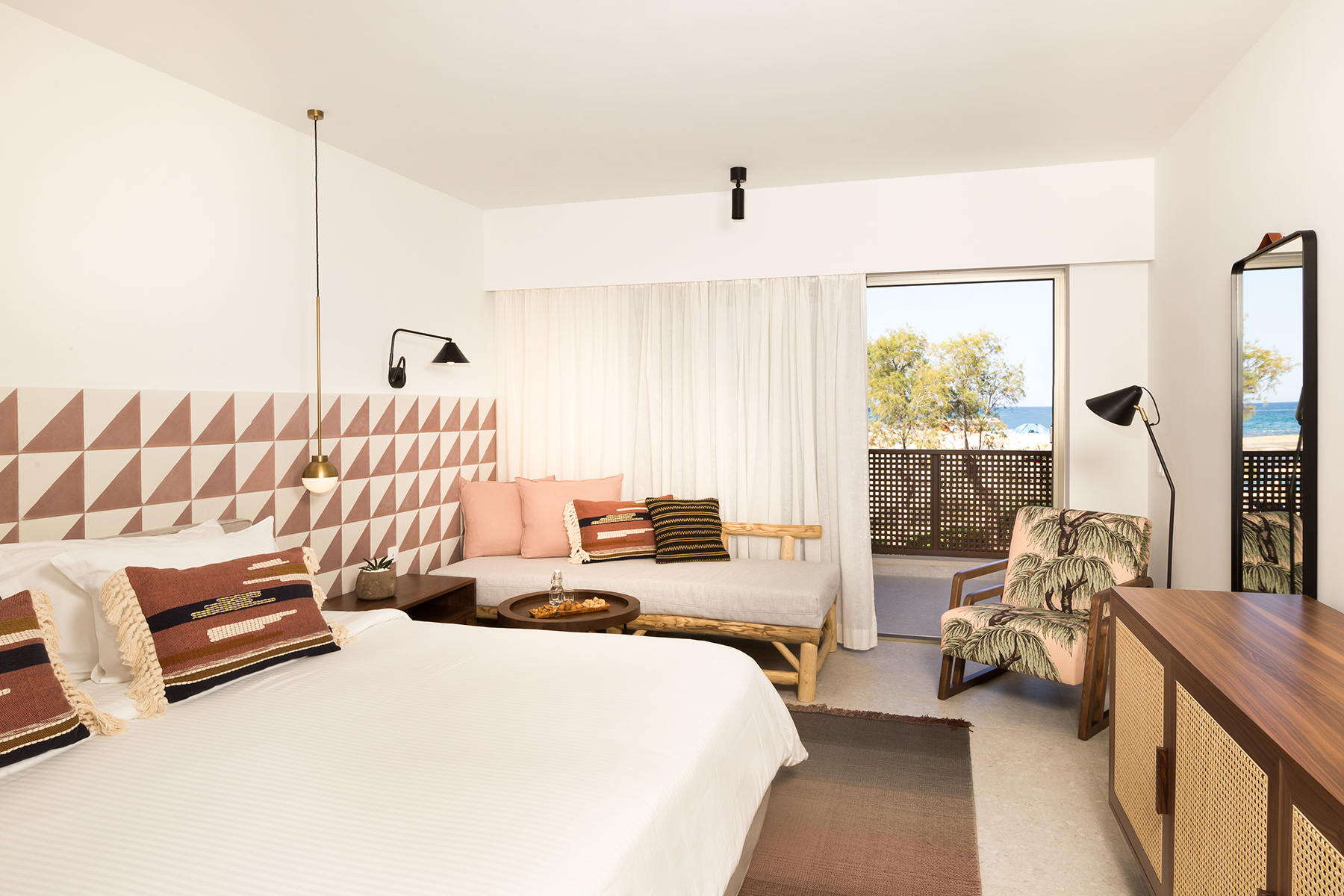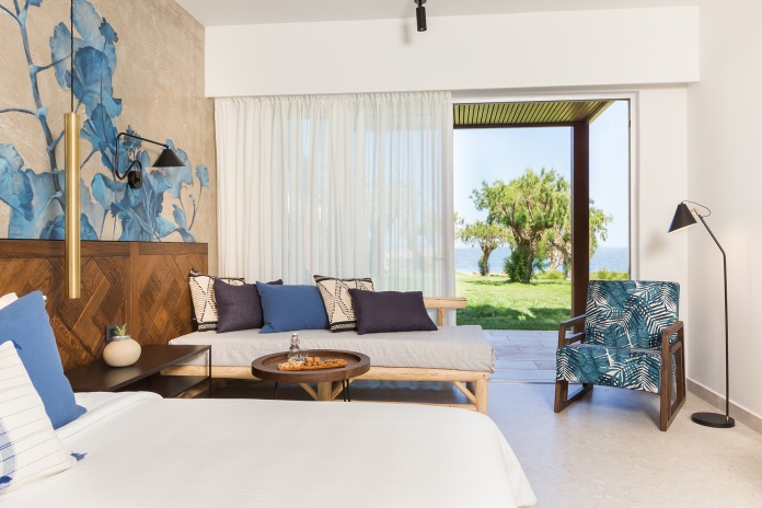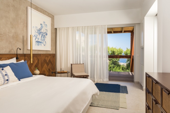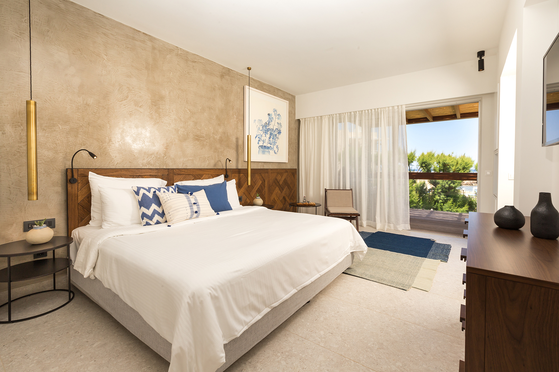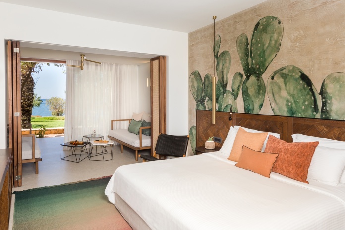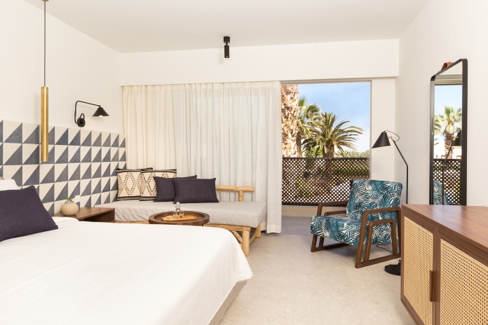 JUNIOR BUNGALOW SUITE - 33 м2, максимально 3 человека. Состоит из спальни с зоной гостиной, ванной комнаты и балкона с боковым видом на море.