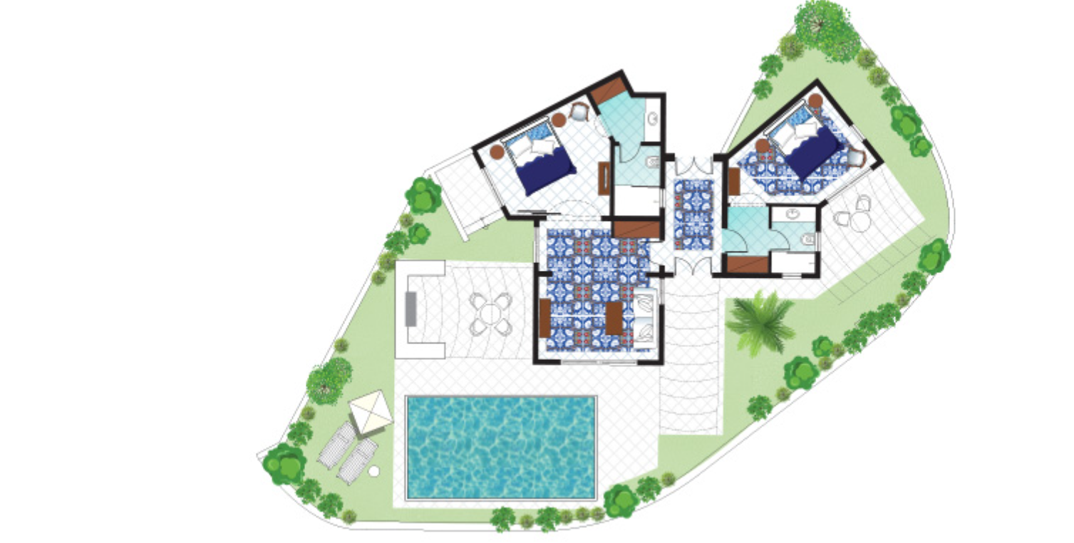 Одноуровневый или двухуровневый номер, 2 спальни с кроватями king-size, возможно дополнительно односпальная кровать, одна или две ванные комнаты с душем, частная беседка на пляже, в некоторых виллах на верхнем этаже — частная открытая гидромассажная ванна, терраса (4 – 10 м²), вид на сад, план номера, см. фото номера;
