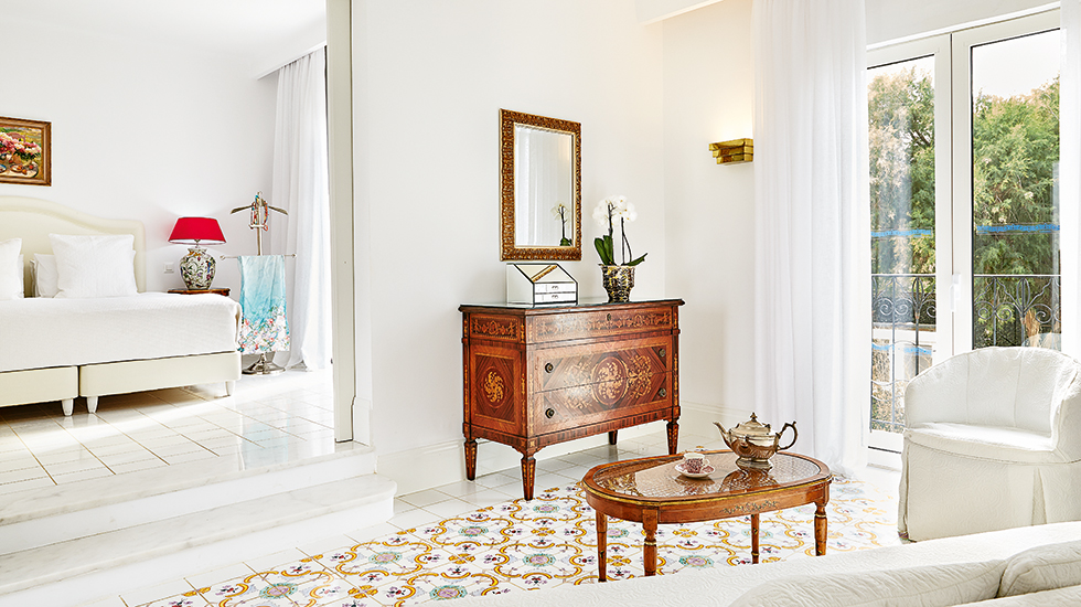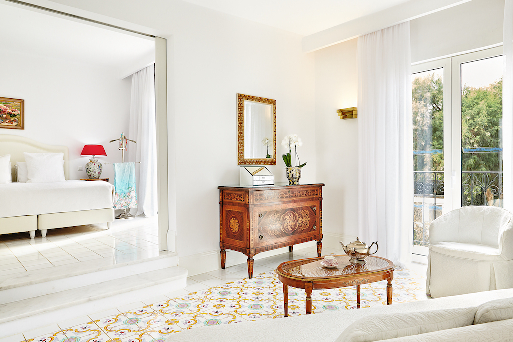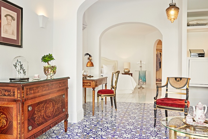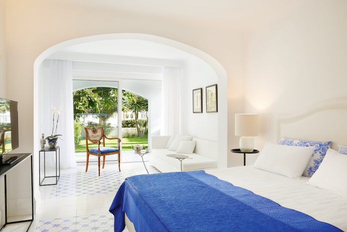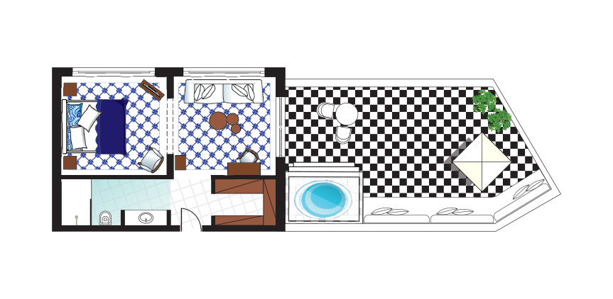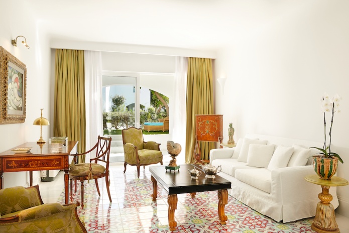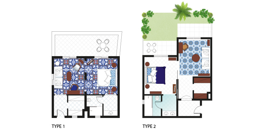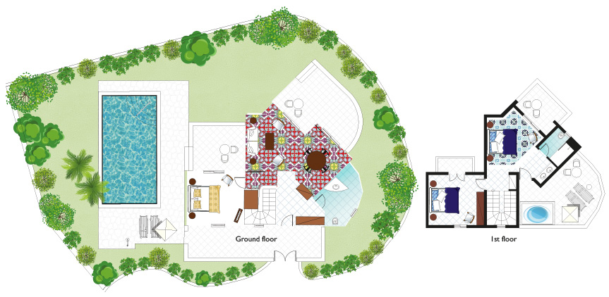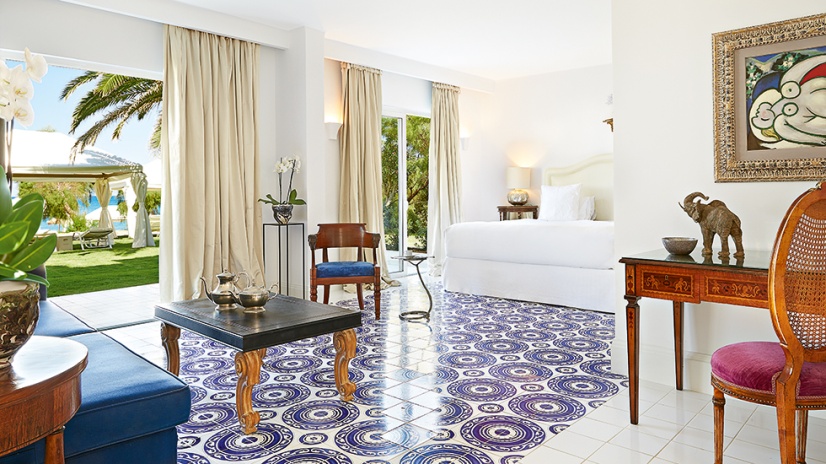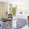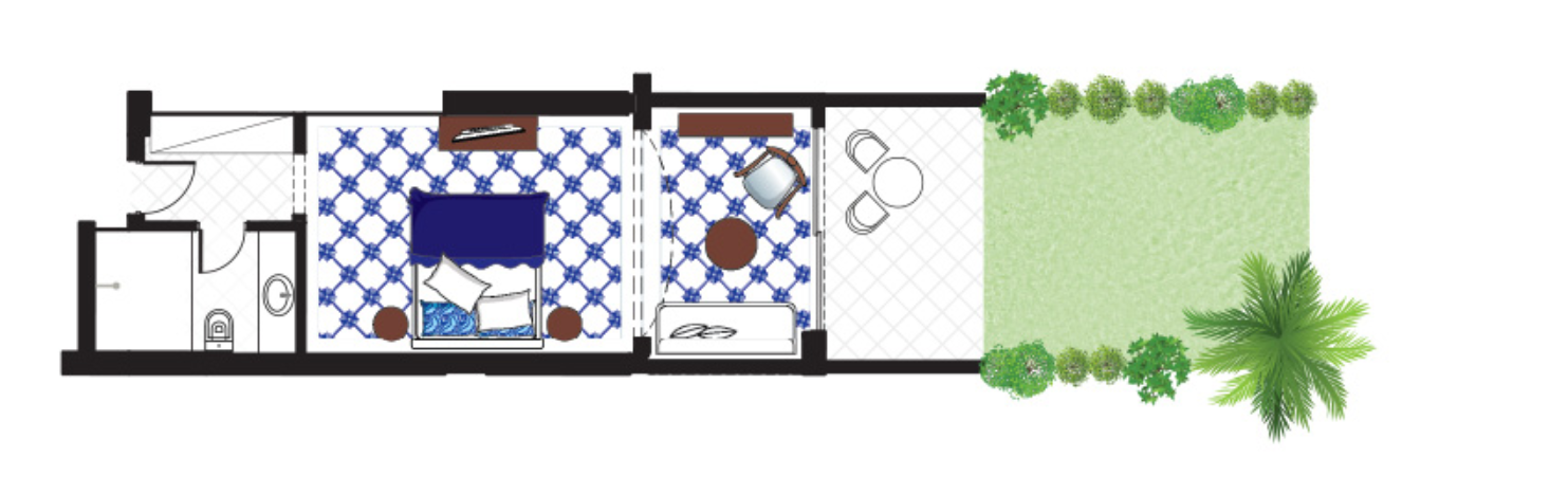 Расположены в главном здании близко к бассейну, на первом этаже (ground floor), с видом на сад, двуспальная кровать king-size, гостиная зона с односпальной дополнительной кроватью, ванная комната с душем, терраса (7 м²), частный садик, план номера, см.фото номера;