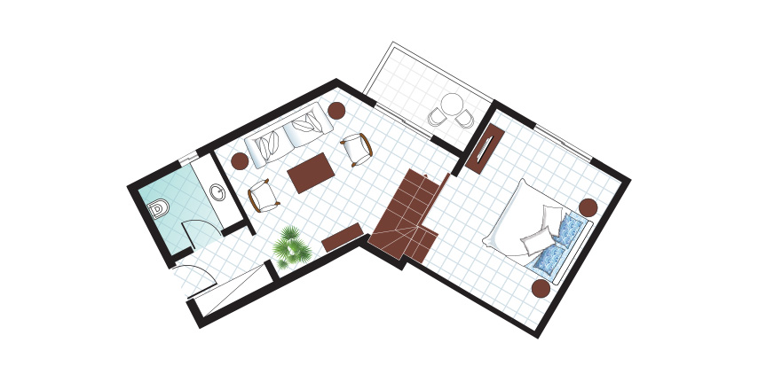 Номера расположены в основном здании, на 3 этаже (2nd floor), с видом на море, номер открытой планировки: зона спальни с двуспальной кроватью king-size, зона гостиной с диваной, ванная комната с душем, меблированная просторная терраса (20 м²) с джакузи, план номера, см.фото номера;