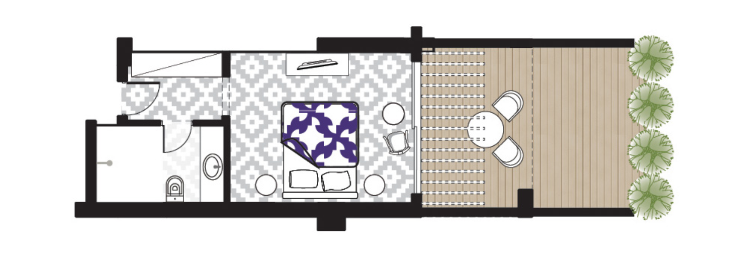 Расположены в бунгало на первом и втором этажах (ground, 1st), с видом на сад, номер открытой планировки или вариант с раздвижной дверью; двуспальная кровать размера king-size и односпальная кровать, ванная комната с 1 или 2 раковинами и душем, балкон или терраса (3 – 9 м²), см.план номера, см.фото номера;