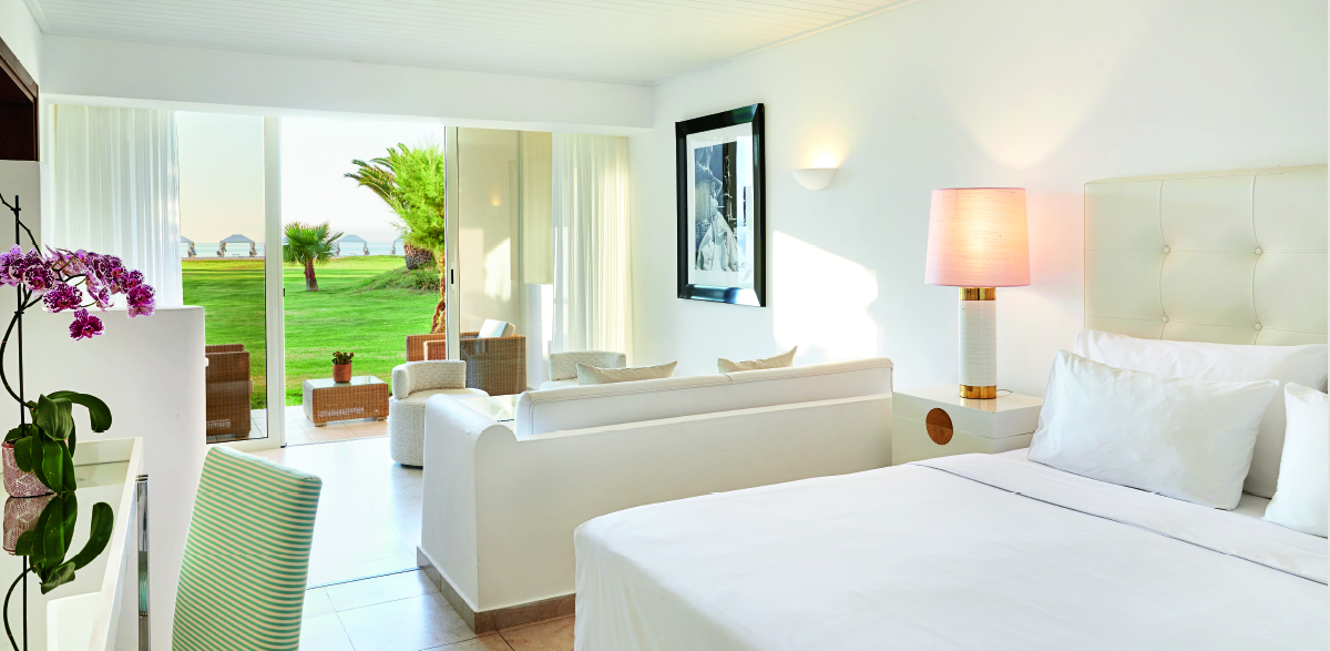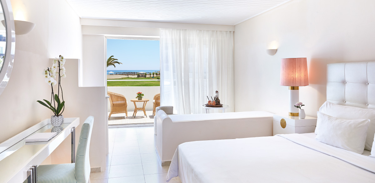 Номера расположены у пляжа на первом и втором этажах (ground/first floor), с прямым видом на море, двуспальная кровать king-size и односпальный диваном-софа, мраморная ванная комната с 1 умывальником и душем, терраса или балкон (9 м²), план номера, фото номера;