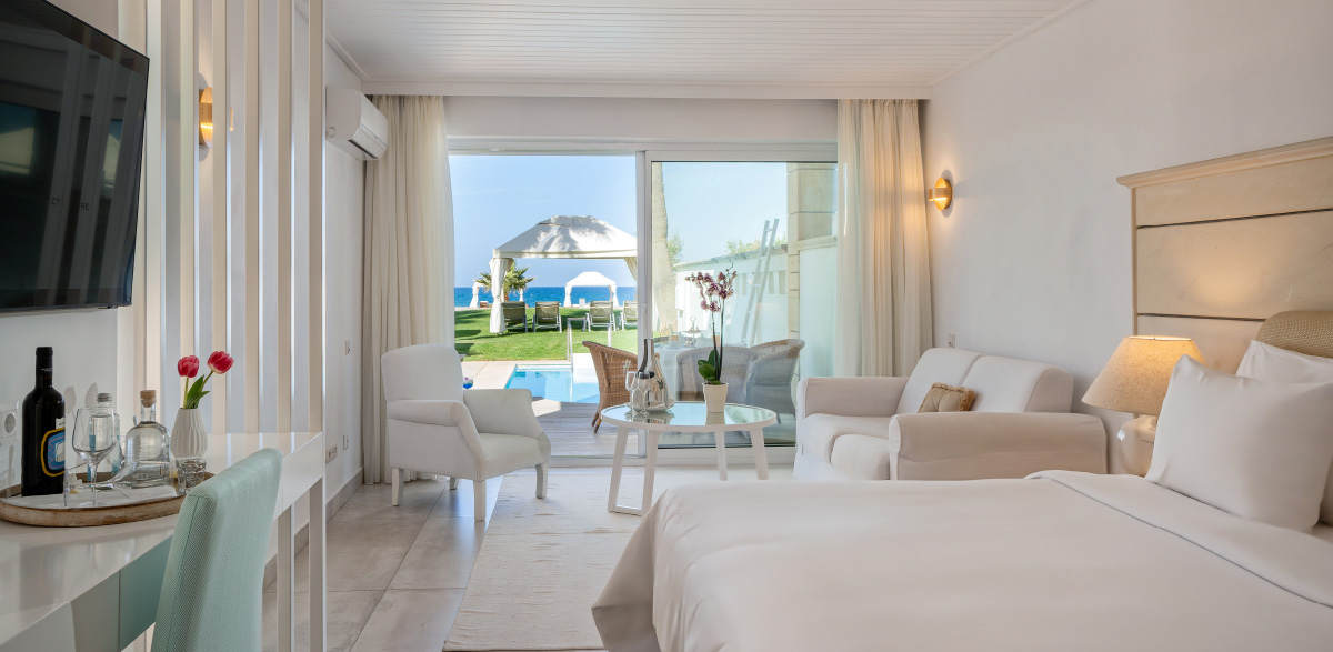 - Junior Suite Sea Front Private Pool (40 м², макс. 3 или 2+1).