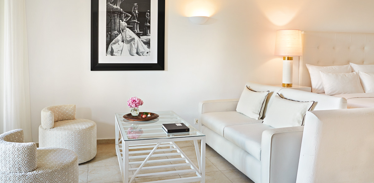 Номера расположены в пентхаусе главного здания, панорамный вид на море, двуспальная кровать king-size, зона гостиной с диваном, мраморная ванная комната с 2 раковинами и ванной, балкон (9 м²); ,