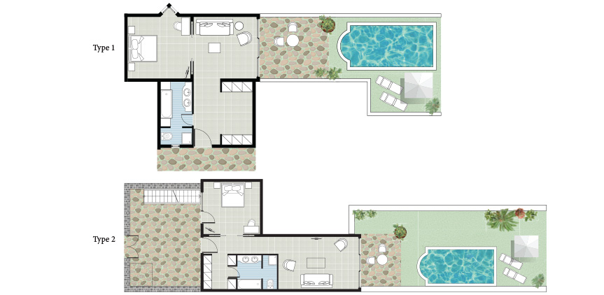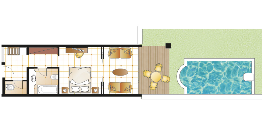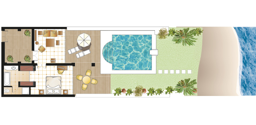 Номера расположены у пляжа, прямой вид на море, спальня с кроватью king-size, гостиная комната с односпальным софа-диваном, ванная комната с одной раковиной, гидромассажной ванной и отдельной душевой кабиной, терраса, собственный бассейн (до 23 м²), частная беседка, приватный входной дворик, общая внешняя площадь – 30 м², прямой выход к пляжу, план номера, фото номера;