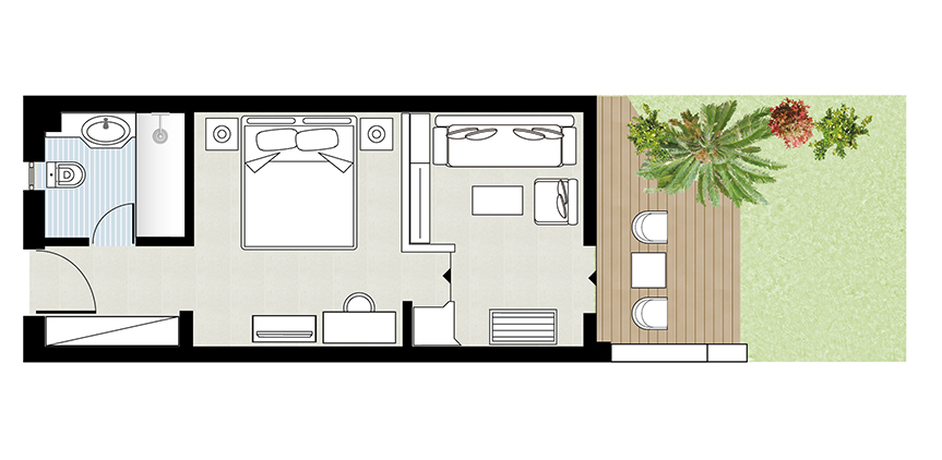 Номера расположены у пляжа, прямой вид на море, двуспальная кровать и зона гостиной с одноместным диваном-софа, ванная комната с ванной, терраса с зоной отдыха, частный бассейн (12,5 м²), внутренний дворик, общая внешняя площадь – 25 м², прямой доступ к пляжу, план номера, фото номера;