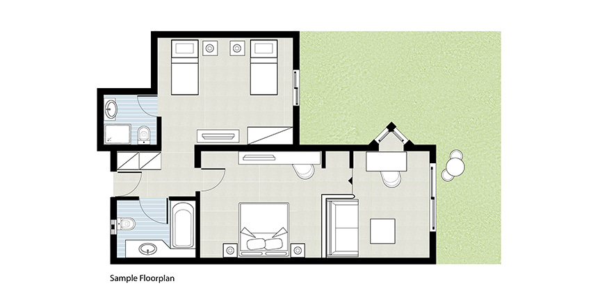 Номера расположены в саду на первом (ground floor) этаже, 2 спальни (двуспальная кровать и 2 односпальные кровати), зона гостиной с диваном-софа, 2 ванные комнаты (одна с ванной, другая с душем), вид на сад, терраса (9 – 15 м²), план номера, фото номера;