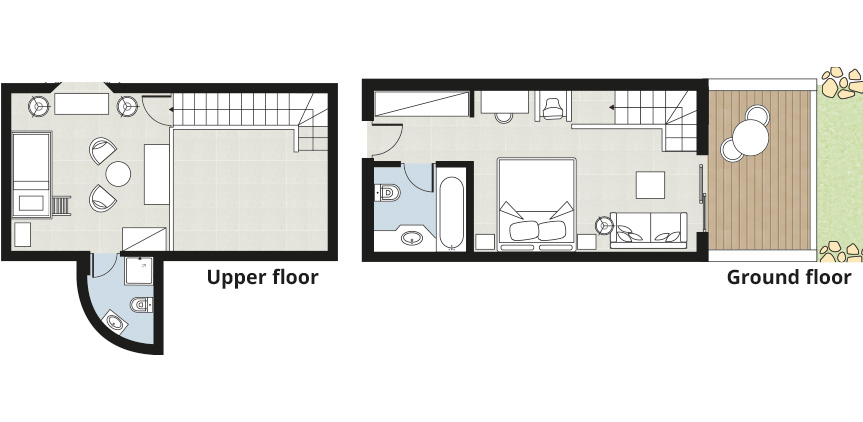 Двухуровневые номера в стиле бунгало, спальня с двуспальной кроватью и гостиной зоной, спальня на втором этаже с двухъярусной кроватью, 2 ванные комнаты (одна с ванной, другая с душем), терраса (9 м²), вид на сад, план номера, фото номера;