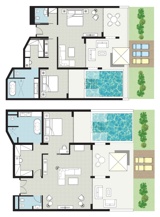 Номера расположены во всех корпусах, на втором и третьем этажах (1st и 2nd), спальня с двуспальной кроватью king-size, гостиная комната с 2 диванами софа (раздвижная дверь между комнатами), 2 ванные комнаты, 2 балкона (16 м²), прямой вид на море, см.план номера, см.фото номера;