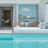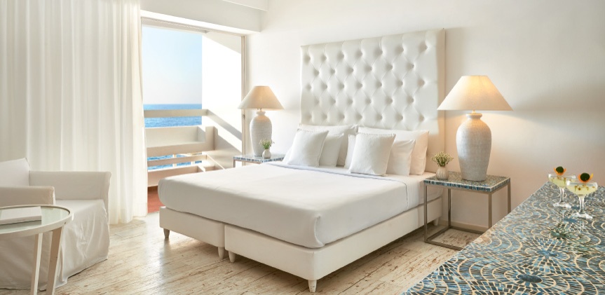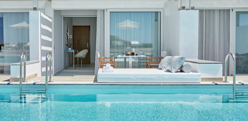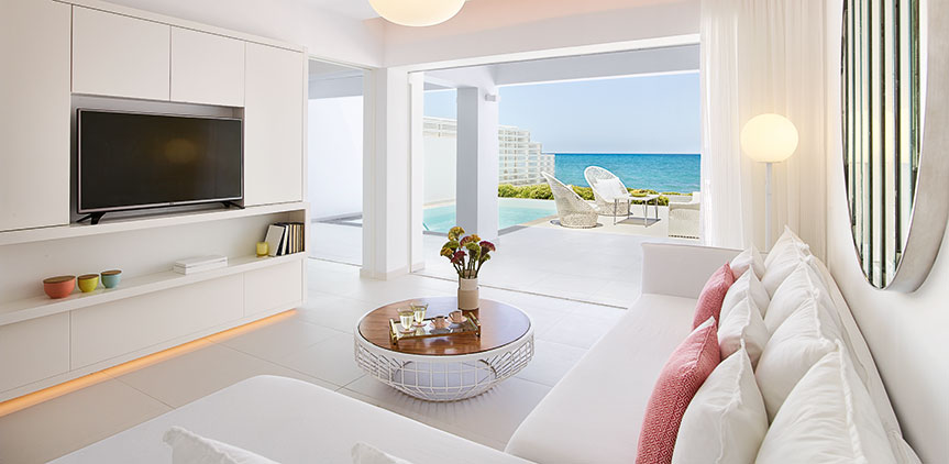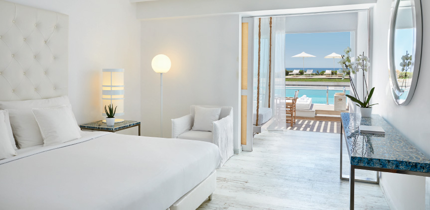 Номера расположены в корпусах White, Palace и Rethymno на первых этажах у кромки шеринг бассейна курорта, спальня с кроватью king-size или 2 односпальными кроватями, гостиная с односпальной кроватью (гостиная от спальни отделена раздвижной панелью), ванная комната с ванной, стеклянные окна от пола до потолка, терраса (8 м²), вид на море, прямой доступ к бассейну (общий бассейн 210 м²), см.план номера, см.фото номера;