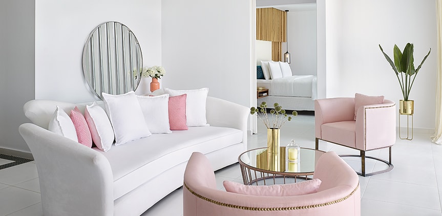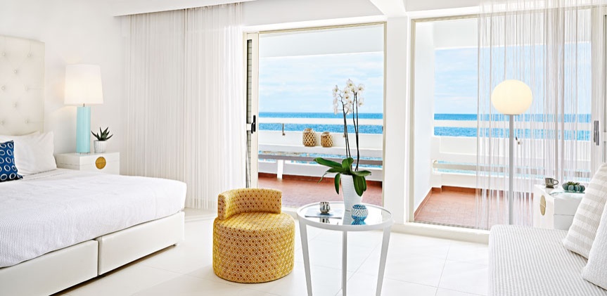 Номера расположены в корпусах Blue, и Rethymno на первом этаже, с видом на море. Спальня с кроватью king-size, гостиная с двумя диван-кроватями, просторная гардеробная зона, большие стеклянные панели от пола до потолка, ванная комната с двумя раковинами, ванной и душевой кабиной, терраса (до 40 м²) в саду с шезлонгами и зонтиками, прямой доступ к общему бассейну курорта (350 м²), см.план номера, см.фото номера;