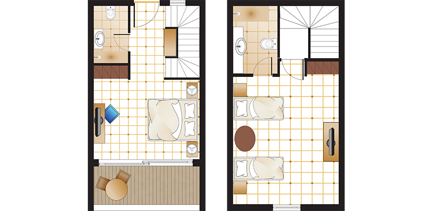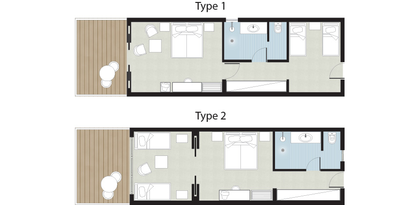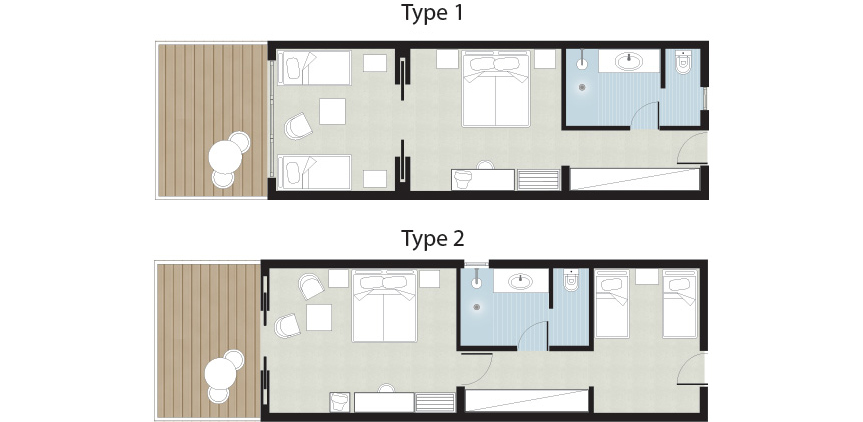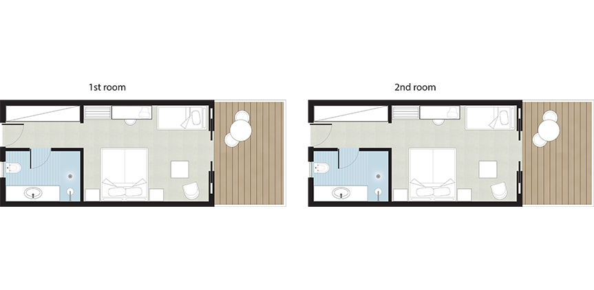 Номера расположены в бунгало на первом – втором (ground, 1st), рядом с пляжем, 2 спальни: двуспальная кровать king-size или 2 односпальные кровати, ванная комната с душем, балкон или терраса (3-5 м²), вид на море, см. план номера, см.фото номера;