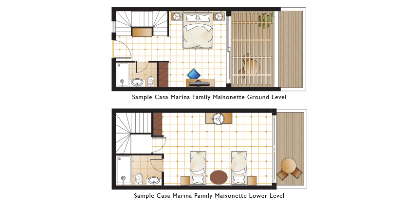 Специально разработанные для семейного отдыха и уединения, семейные мезонеты Casa Marina предлагают раздельные спальные зоны на двух уровнях, а также просторную крытую террасу с частным садом. В здании Casa Marina, рядом с аквапарком. 2 спальни (двуспальная кровать king-size и 2 односпальные кровати), гардеробная, 2 ванные комнаты с душем, вид на сад/боковой вид на море, см. план номера, см.фото номера;
