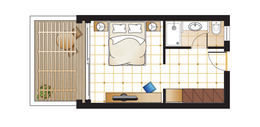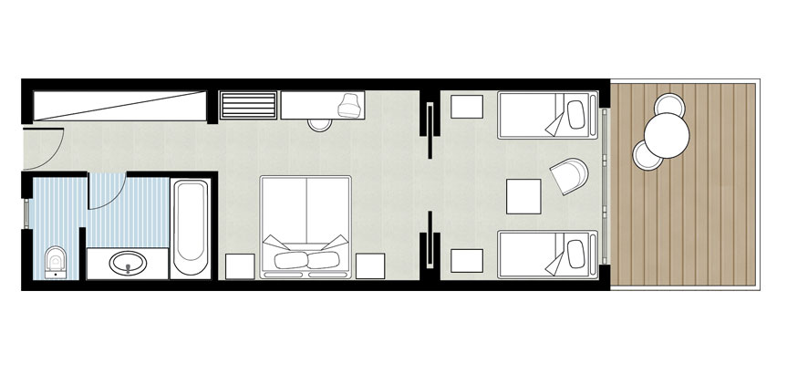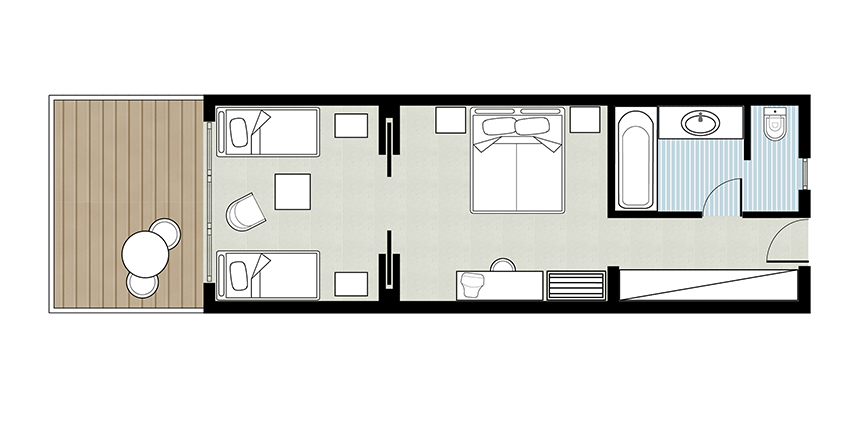 Номера расположены в бунгало на первом – втором (ground, 1st), рядом с пляжем, 2 спальни: двуспальная кровать king-size или 2 односпальные кровати, ванная комната с ванной, балкон или терраса (3-5 м²), боковой вид на море, см.план номера;