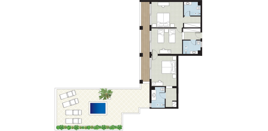 В зоне Marine Palace, на самом верхнем этаже главного здания (3 rd floor), 2 спальным зоны с раздвижной дверью между ними: двуспальная кровать king-size или 2 односпальные кровати и 2 оодноспальные кровати, ванная комната с душем, частная веранда на крыше, открытая гидромассажная ванна, терраса, внешняя площадь – 45 м², вид на море, см. план номера, см.фото номера;