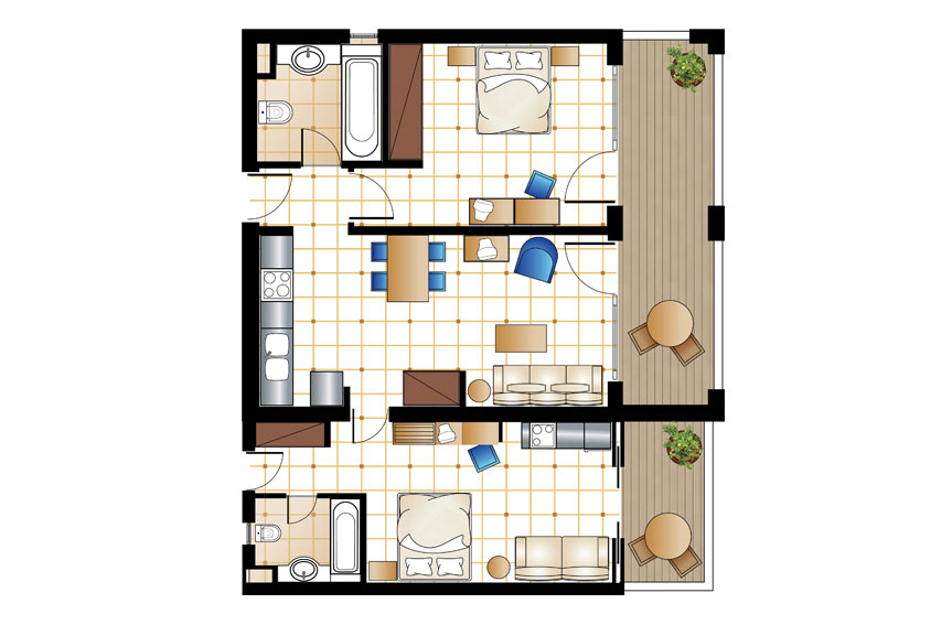 Семейные номера на первом – втором этажах, 2 спальни с двуспальными кроватями king-size и ванными комнатами с ванной (в одной спальне есть ещё диван и кухонный уголок), гостиная комната с диваном, кухней и обеденной зоной, балкон или терраса, вид на сад/бассейн, см.план номера, см.фото номера.