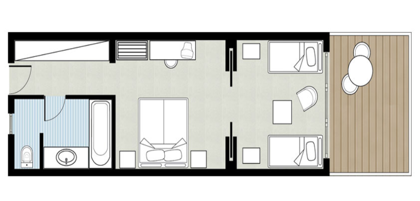 Номера расположены в бунгало на первом – втором (ground, 1st), рядом с пляжем, 2 спальни: двуспальная кровать king-size или 2 односпальные кровати, ванная комната с ванной, балкон или терраса (3-5 м²), боковой вид на море, см.план номера;