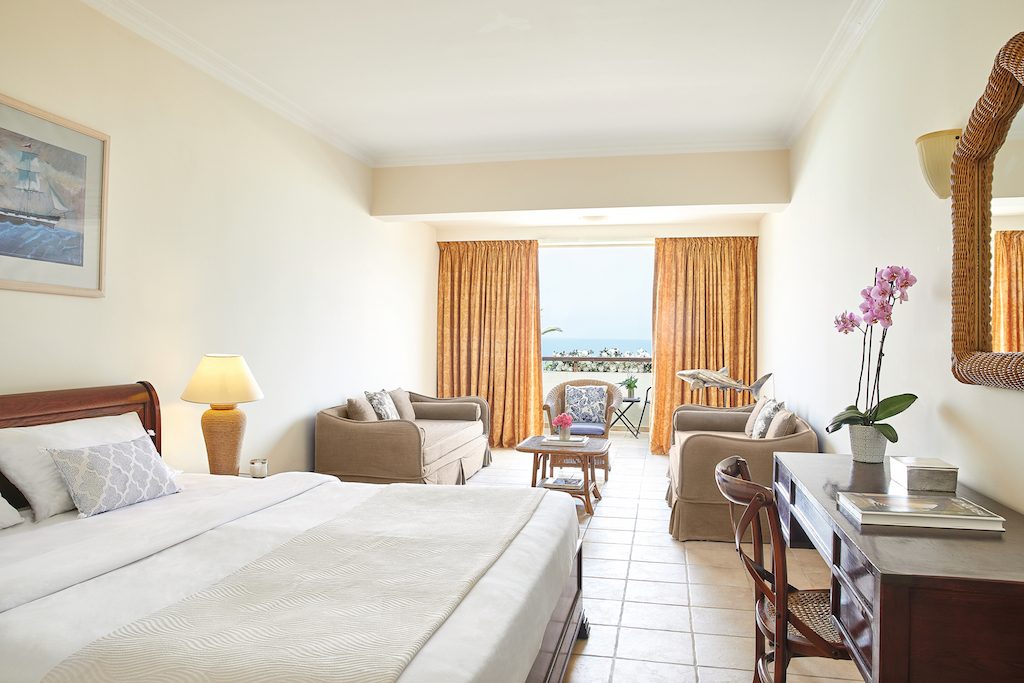 Номера открытой планировки, расположены в основном здании на первом – третьих этажах (ground, 1st, 2nd), двуспальная кровать king-size и 2 односпальных дивана-софа, ванная комната с душем, балкон или терраса, боковой вид на море, см. план номера, см.фото номера;