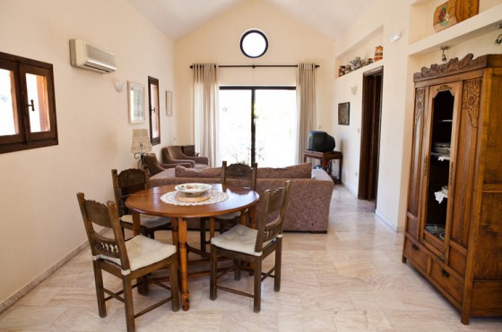 Состоит из гостиной с камином, столовой с полностью оснащенной кухней, 2 спален, 2 ванных комнат, террасы с выходом к частному бассейну с морской водой, шезлонгов, зонтиков. 200-250 метров от моря.