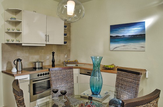 Состоит из гостиной с камином, столовой с полностью оснащенной кухней, 2 спален, 2 ванных комнат, террасы (98 м2) с выходом к частному бассейну (4*8) с морской водой, шезлонгами, зонтиками, переносного барбекю. 200-250 метра от моря.